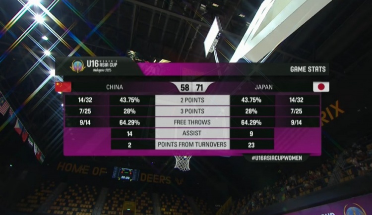 中国队:李沅珊16分6板1助、孙晗昀13分4板2助、朱思雨9分1板2助、孙璇7分7板5助、袁艺芯7分2板1助、孟家艺3分1板、刘瑞2分6板2助、汤雅童1分3板1助、李玉乾1板