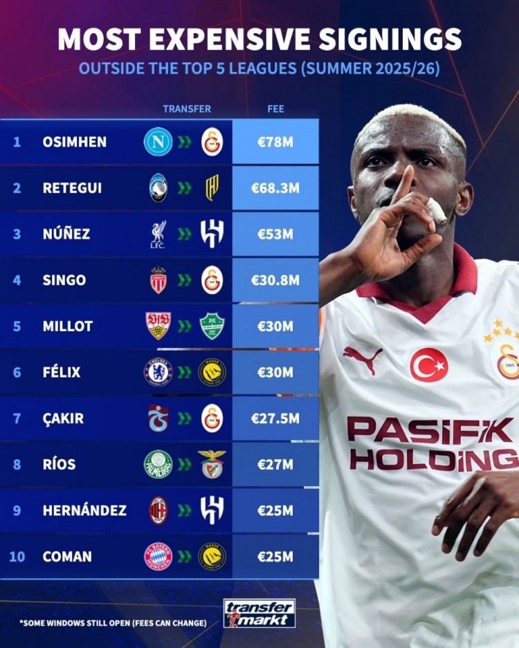 9月4日讯 德国转会市场列出了今夏五大联赛之外球队的最贵引援排名,奥斯梅恩居首,雷特吉次席。